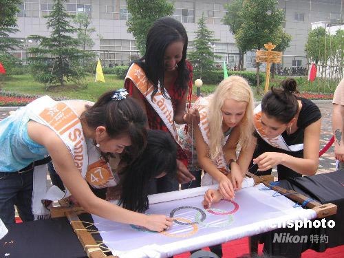 圖:世界休閑佳麗手串珍珠共制奧運(yùn)五環(huán)旗(2)