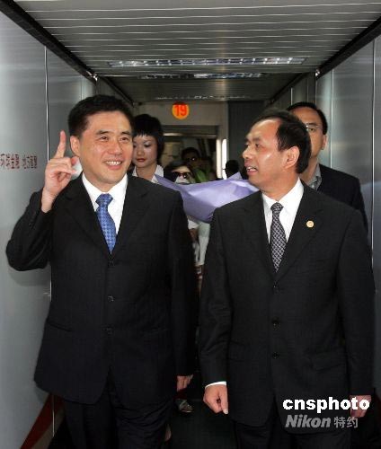 圖為郝龍斌(左)與上海市臺辦主任楊建榮(右)在機場談笑甚歡。中新社發(fā) 潘索菲 攝