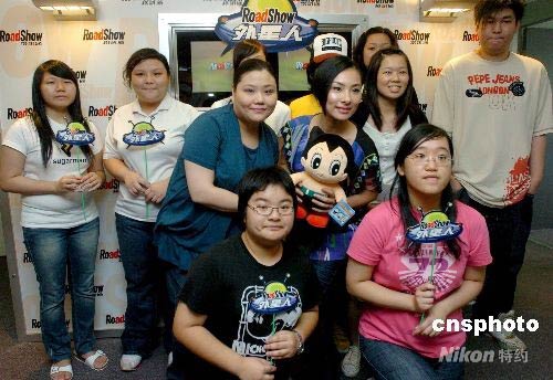 圖為“粉絲”贈送劉璇動畫明星“阿童木”毛公仔,并與偶像合影。中新社發(fā) 鄧慶樂 攝