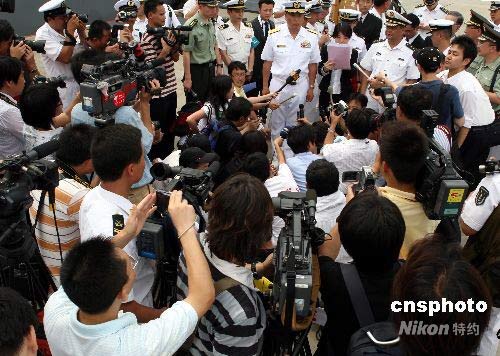 中日海軍高級將領(lǐng)在湛江碼頭接受者采訪