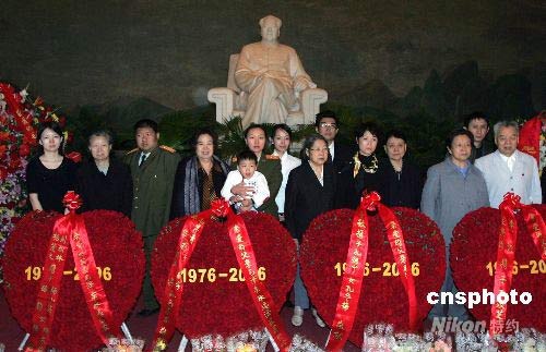 資料圖為2006年9月9日毛澤東逝世三十周年紀(jì)念日,毛澤東的親屬匯聚位于北京天安門廣場的“毛主席紀(jì)念堂”敬獻(xiàn)鮮花。劉思齊(左二,毛澤東長子毛岸英之妻)、毛新宇(左三,毛澤東之孫)、邵華(左四,毛澤東之子毛岸青妻子)、毛東東(左五,毛澤東重孫)、劉濱(左六,毛澤東孫媳婦)、李敏(左八,毛澤東女兒)、孔繼寧(左九,毛澤東外孫)、孔東梅(左十,毛澤東外孫女)、李訥(右三,毛澤東女兒)、王孝芝(右二,毛澤東外孫)、王景清(右一,毛澤東女婿)等獻(xiàn)花后,在毛澤東塑像前合影。中新社發(fā) 任晨鳴 攝