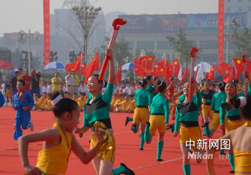 6月25日上午,奧運(yùn)火炬在山西運(yùn)城傳遞。火炬?zhèn)鬟f前,熱烈精彩的祝賀表演。張雷杰 攝