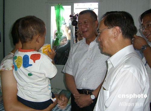 6月28日上午,香港特別行政區(qū)行政長官曾蔭權(quán)、澳門特別行政區(qū)行政長官何厚鏵一行來到彭州市小漁洞鎮(zhèn)江橋村大楠社區(qū)安置點,慰問當(dāng)?shù)厥転?zāi)群眾,了解抗震救災(zāi)情況。中新社發(fā) 郭嘉農(nóng) 攝