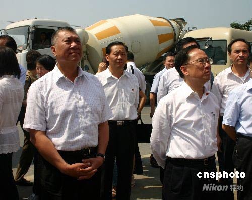 曾蔭權(quán)何厚鏵站在地震廢墟清理現(xiàn)場(chǎng)表情凝重