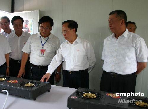 香港特首曾蔭權(quán)、澳門特首何厚鏵一行在四川省副省長魏宏陪同下,抵達(dá)地震重災(zāi)區(qū)彭州市小漁洞鎮(zhèn)大楠社區(qū)安置點(diǎn),慰問當(dāng)?shù)厥転?zāi)群眾,參觀安置房、公共廚房和安置點(diǎn)內(nèi)的娛樂設(shè)施,并體驗(yàn)了公共廁所。中新社發(fā) 霍潺 攝