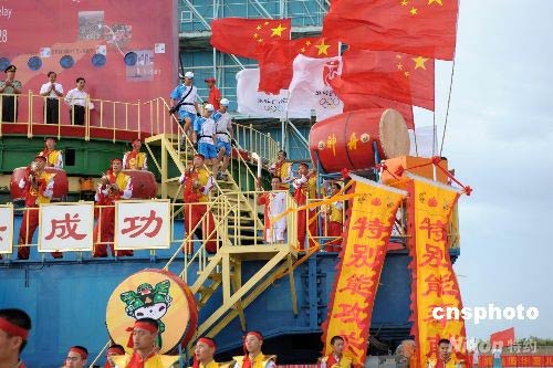 6月28日上午8時(shí),奧運(yùn)火炬航天城傳遞活動(dòng)在載人航天發(fā)射塔架下起跑,英雄航天員費(fèi)俊龍領(lǐng)跑第一棒。 中新社發(fā) 榮鋒 攝