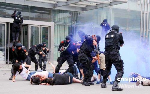 6月30日,山東省反恐怖工作協(xié)調(diào)小組在濟(jì)南成功舉行了“泰山2008”反恐演習(xí)!疤┥2008”反恐演習(xí)以北京奧運(yùn)會(huì)期間可能發(fā)生的恐怖襲擊事件為背景,以有效防范和正確處置為課題,主要目的是檢驗(yàn)和提升山東省城市防范處置恐怖襲擊事件的應(yīng)急反應(yīng)能力、組織指揮能力和綜合保障能力。這次演習(xí)是山東省第一次公安各警種與武警、衛(wèi)生、市政等反恐應(yīng)急力量協(xié)同作戰(zhàn)的合成演習(xí),是第一次以導(dǎo)調(diào)推演方式進(jìn)行的檢驗(yàn)性演習(xí),也是第一次通過全省公安視音頻系統(tǒng)同步傳輸?shù)姆纯盅萘?xí)。中新社發(fā) 陳 進(jìn) 攝