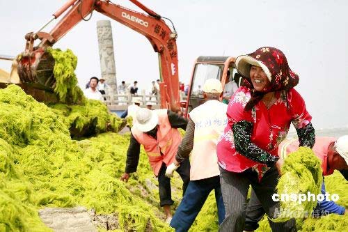 圖為乳山市民眾在近海清理海灘與近海的滸苔。自6月28日以來,在繼奧帆賽舉辦地青島近海出現(xiàn)大量漂浮海藻——滸苔后,距青島僅一個(gè)多小時(shí)車程的乳山市近海也現(xiàn)了大量滸苔,雖然這些滸苔無毒無污染,但仍然引起乳山市的高度關(guān)注,目前乳山近海附近三千余民眾正有序地清理著近海滸苔,截止發(fā)稿時(shí)該市已清理滸苔二萬余噸。中新社發(fā) 劉國賢 攝