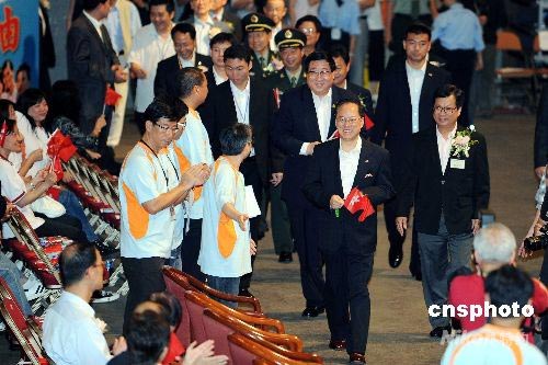 七月一日,香港回歸祖國(guó)十一周年紀(jì)念日,香港各界慶典委員會(huì)在香港體育館舉行盛大綜合文藝匯演,表達(dá)對(duì)汶川大地震災(zāi)后重建、慶祝香港回歸及北京奧運(yùn)的支持。特區(qū)行政長(zhǎng)官曾蔭權(quán)、中聯(lián)辦主任高祀仁等嘉賓出席,并與現(xiàn)場(chǎng)數(shù)萬(wàn)觀眾共同歡慶。中新社發(fā) 洪少葵 攝