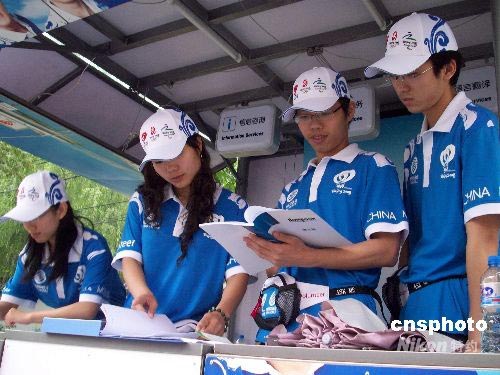 7月1日,來自北京一所高校的志愿者們正式進(jìn)入海淀區(qū)某街道的志愿者服務(wù)站,開始上崗服務(wù)。經(jīng)過封閉培訓(xùn)、考核通過的城市志愿者,將在歷時(shí)百天的的服務(wù)日中,向參加北京奧運(yùn)會(huì)、殘奧會(huì)的運(yùn)動(dòng)員、工作人員、觀眾、記者、游客以及北京市民提供信息咨詢、應(yīng)急服務(wù)、語言翻譯等多項(xiàng)熱情周到的服務(wù)。中新社發(fā) 馮軍(北京) 攝