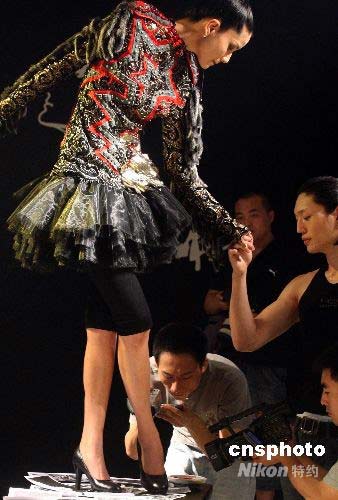 7月1日晚,“北京凱萊希模特學(xué)校2008年畢業(yè)匯報(bào)表演”在北京舉行。來自美國芝加哥大學(xué)博士Angela Zito編導(dǎo)創(chuàng)意的高跟鞋藝術(shù)秀別具特色,13位女模特,在中國傳統(tǒng)文士的書桌上表演走,坐,躺。男同學(xué)的加入令高跟鞋展現(xiàn)出男性和女性之間糾結(jié)的關(guān)系。名模陳娟紅最后登上書桌,穿上一雙鞋跟已經(jīng)被刻上圖章的高跟鞋,把圖章蓋在由這次活動參與人員提供的照片上。這些照片代表著人們愿意重新體味過去的生活情景,該怎樣面對記憶,是把他們?nèi)釉谝贿厜m“封”,還是不斷地重新“開”啟,探究著占有的象征,在現(xiàn)世和回憶之間的重新定位。圖為名模陳娟紅書桌上展示高跟鞋藝術(shù)秀。中新社發(fā) 錢興強(qiáng) 攝