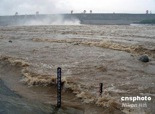 2008年7月5日,大雨中的三峽大壩開啟6個深孔泄洪,每秒下泄流量11000立方米,這是三峽工程2008年首次開閘泄洪。連日來,長江三峽庫區(qū)持續(xù)大到暴雨,長江上游來水猛漲,7月5日10時三峽入庫流量達(dá)34500立方米/秒,三峽壩前水位為145.79米。據(jù)長江防汛抗旱總指揮部披露,預(yù)計未來幾天長江上游仍將持續(xù)降雨,三峽入庫流量將持續(xù)超過26000立方米/秒,三峽大壩將保持持續(xù)泄洪狀態(tài)。中新社發(fā) 劉君鳳 攝