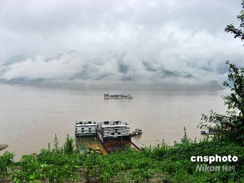 2008年7月5日,三峽大壩上游近壩區(qū)湖北秭歸大雨滂沱,雨后水黃山翠云蒸霧繞,群峰連綿起伏時隱時現(xiàn),恰似天上“仙境”落人間。據(jù)當(dāng)?shù)鼐用窠榻B,這是三峽成庫后,首次出現(xiàn)引人入勝的夏霧美景。中新社發(fā) 韓玉洪 攝