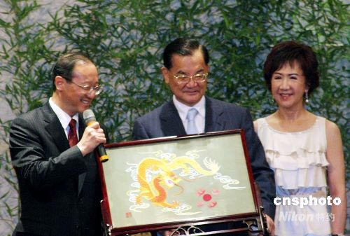 7月5日,中國國民黨榮譽主席連戰(zhàn)夫婦及部分國民黨高層在臺北會見到訪的海峽兩岸旅游交流協(xié)會會長邵琪偉一行。連戰(zhàn)表示,大陸居民赴臺旅游和兩岸周末包機的實現(xiàn),不僅為兩岸關(guān)系和平發(fā)展的偉大目標(biāo)作出了貢獻(xiàn),更為中華民族興盛發(fā)展寫下了新的一頁。會見之后,連戰(zhàn)和邵琪偉互贈禮物。禮物皆與“龍”有關(guān)。連戰(zhàn)贈給邵琪偉的禮物是由臺灣新竹工藝大師制作的琉璃“吉祥云龍”,“象征兩岸同屬中華民族,都是炎黃子孫,期待將來有更多的客運、貨運包機飛翔在兩岸的天空中”。邵琪偉贈送給連戰(zhàn)的是湘繡龍紋雙面繡。中新社發(fā) 黃少華 攝