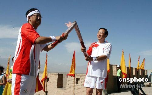 第203棒火炬手楊壯(左)和第204棒火炬手、甘肅省副省長郝遠(yuǎn)在“天下第一雄關(guān)”的城樓上交接火炬。 中新社發(fā) 周兆軍 攝