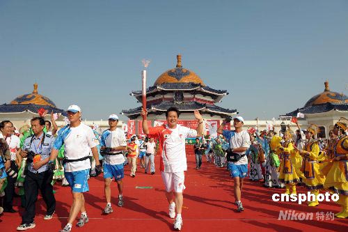 7月9日上午8時30分左右,隨著首棒火炬手、內蒙古獲得殘奧會金牌第一人哈斯勞高擎“祥云”火炬在成吉思汗陵前跑出第一棒,北京奧運火炬在鄂爾多斯的傳遞拉開了帷幕。 中新社發(fā) 廖攀 攝