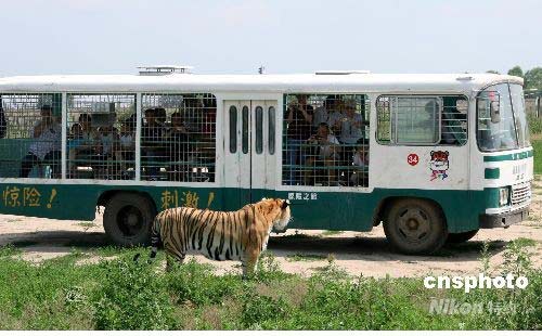 7月10日,在哈爾濱的東北虎林園,一只東北虎與坐在游覽車內(nèi)的游人相互張望。中新社發(fā) 周兆軍 攝