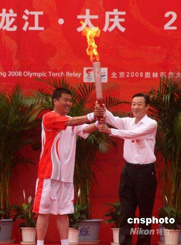 7月12日,北京奧運(yùn)火炬在“石油之城”大慶傳遞,“鐵人鉆井隊(duì)”第19任隊(duì)長(zhǎng)胡志強(qiáng)(左)從大慶市委書(shū)記韓學(xué)鍵手中接過(guò)第一棒火炬。 中新社發(fā) 周兆軍 攝