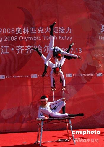 7月13日,北京奧運火炬在“丹頂鶴之鄉(xiāng)”齊齊哈爾傳遞,當(dāng)?shù)匦‰s技演員打扮成仙鶴模樣,亮出絕技迎接奧運火炬。 中新社發(fā) 周兆軍 攝