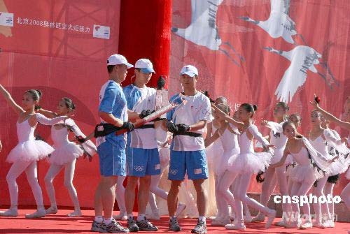 7月13日,北京奧運火炬在“丹頂鶴之鄉(xiāng)”齊齊哈爾傳遞。當(dāng)圣火護衛(wèi)隊員點燃火炬時,當(dāng)?shù)匦∨笥寻缱饕蝗合生Q在火炬周圍翩翩起舞。 中新社發(fā) 周兆軍 攝