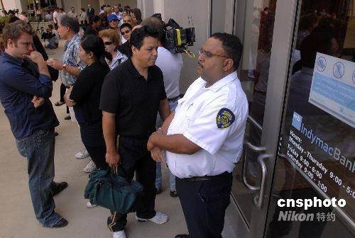 當(dāng)?shù)貢r(shí)間7月14日上午,數(shù)百名儲(chǔ)戶在加州帕薩迪納市的“因迪美聯(lián)邦銀行”門(mén)口排隊(duì)等待提取現(xiàn)金。 受次貸危機(jī)影響,6月底以來(lái),美國(guó)最大的抵押貸款商因迪美銀行(IndyMac Bank)遭客戶擠兌,在11天內(nèi)被客戶提走現(xiàn)金13億美元,本月11日,因流動(dòng)性嚴(yán)重不足,該銀行被美國(guó)儲(chǔ)蓄管理局勒令關(guān)閉,并將其業(yè)務(wù)轉(zhuǎn)交至聯(lián)邦存款保險(xiǎn)公司運(yùn)營(yíng),該銀行成為美國(guó)次貸危機(jī)以來(lái)被關(guān)閉的最大抵押貸款商。被接管并更名后的“因迪美聯(lián)邦銀行”14日開(kāi)始營(yíng)業(yè),大批客戶仍擔(dān)心財(cái)產(chǎn)受損,一大早便排隊(duì)等待提現(xiàn)。中新社發(fā) 張煒 攝