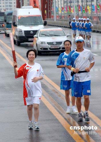 7月15日下午,奧運(yùn)火炬在吉林市傳遞,已經(jīng)懷孕7個(gè)月的火炬手李圓傳遞火炬。 中新社發(fā) 廖攀 攝