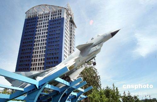 2008年7月17日,殲十飛機(jī)景觀工程在中國(guó)航空工業(yè)第一集團(tuán)公司總部前“一航花園”隆重揭幕。這標(biāo)志著殲十飛機(jī)景觀工程正式落戶(hù)朝陽(yáng)CBD。這架殲十是完全根據(jù)真機(jī)的一比一高仿模型,機(jī)上細(xì)節(jié)分毫畢現(xiàn)。殲十作出大仰角爬升的姿態(tài),翼下掛有國(guó)產(chǎn)雷石6滑翔制導(dǎo)炸彈、霹靂9C近距格斗空空導(dǎo)彈及霹靂12中距空空導(dǎo)彈。中新社發(fā) 博芽影像 攝
