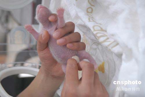 工作人員給熊貓幼仔人工排便