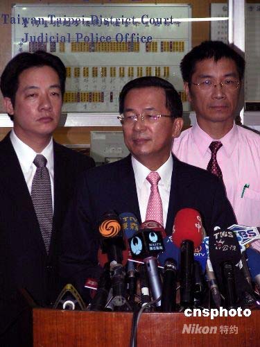 7月21日上午,臺(tái)北地方法院開(kāi)庭審理臺(tái)灣地區(qū)前領(lǐng)導(dǎo)人陳水扁(中)及民進(jìn)黨籍“立委”賴(lài)清德(左)、前“立委”徐國(guó)勇(右)等被控誹謗案,陳水扁首度以被告身份到庭應(yīng)訊。庭審之后,陳水扁與賴(lài)清德、徐國(guó)勇在臺(tái)北地院召開(kāi)記者會(huì)。中新社發(fā) 徐長(zhǎng)安 攝