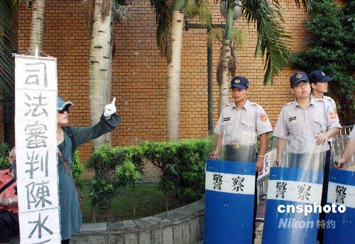 7月21日,臺(tái)灣前海軍中將雷學(xué)明等控告陳水扁等人誹謗案在臺(tái)北地方法院開庭。這是是陳水扁卸任臺(tái)灣領(lǐng)導(dǎo)人后首度至法院出庭,創(chuàng)下卸任領(lǐng)導(dǎo)人以被告出庭的首例。為此,大批警方出動(dòng)維持秩序,不過仍發(fā)生陳水扁上午在步入法院時(shí)遭一民眾踹一腳的意外。圖為一民眾在以盾牌戒備的警察前手持紙牌表達(dá)觀點(diǎn)。中新社發(fā) 黃少華 攝