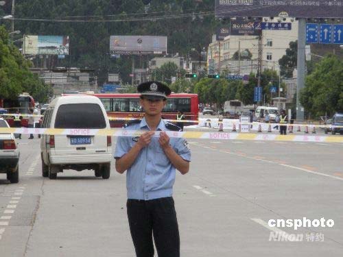 7月21日上午昆明市發(fā)生的巴士連環(huán)爆炸事件導致二人死亡十四人受傷,據(jù)介紹,事發(fā)車輛隸屬于昆明公交五公司,事發(fā)后五公司停止了所有公交車輛的運行,對車場內(nèi)所有車輛進行了細致的檢查,在對事故車輛進行檢查時發(fā)現(xiàn),引發(fā)爆炸的物品初步懷疑為雷管狀的可疑物。圖為21日下午,公交爆炸事件車輛所屬公司逐步恢復營運。圖為21日下午,警方仍對公交爆炸事件中的事件岷山現(xiàn)場進行封鎖。中新社發(fā) 蔣晨 攝