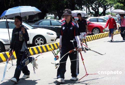 圖為中午,射箭運動員們正結束訓練,返回休息。中新社發(fā) 黃少華 攝