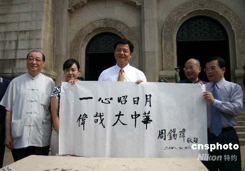 七月二十六日,臺北縣長周錫瑋率臺北縣南京參訪團一行十人拜謁南京中山陵,題字“一心昭日月,偉哉大中華”。周錫瑋一行二十五日晚間乘坐南京首航后的第四班兩岸周末包機抵達南京祿口國際機場,開始為期五天的訪問行程。中新社發(fā) 朱曉穎 攝