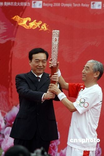 7月27日,河南省委副書記陳全國將火炬交于河南洛陽第一棒火炬手張海(右)手中,張海是當代中國書法掌門人。當日,北京奧運接力到河南省洛陽市。中新社發(fā) 慎重 攝