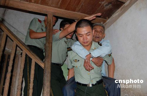 七月二十八日,隨著臺風“鳳凰”逼近福建沿海,駐守福建沿海一線的邊防官兵正全力準備,防抗臺風襲擊。圖為福建福清江陰鎮(zhèn)東霄村的一棟危房中,當?shù)剡叿琅沙鏊俦岩恍袆硬槐愕睦喜D移到安全地帶。中新社發(fā) 朱明海 攝