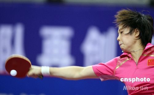 在女團(tuán)比賽中,張怡寧、王楠、郭躍和李曉霞組成女一隊(duì)。圖為張怡寧在比賽中輕取對(duì)手。中新社發(fā) 盛佳鵬 攝