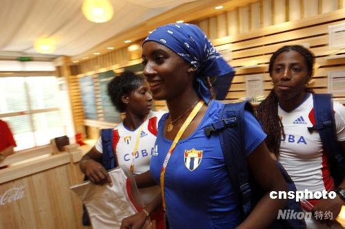 7月29日,來自古巴的女運動員在北京奧運村的紀(jì)念章交換中心參觀。中新社發(fā) 杜洋 攝