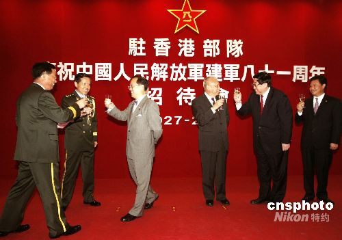 七月三十一日晚,為慶祝中國人民解放軍建軍八十一周年,并感謝特區(qū)政府和香港社會(huì)各界長(zhǎng)期以來對(duì)駐軍的關(guān)心與支持,駐港部隊(duì)在中環(huán)軍營舉辦了“駐香港部隊(duì)?wèi)c祝中國人民解放八十一周年招待會(huì)”。全國政協(xié)副主席董建華、香港特區(qū)行政長(zhǎng)官曾蔭權(quán)、中聯(lián)辦主任高祀任、外交部駐港特派員呂新華、駐港部隊(duì)司令員張少波少將、政治委員劉良凱中將等出席了此次招待會(huì)。中新社發(fā) 張勤 攝
