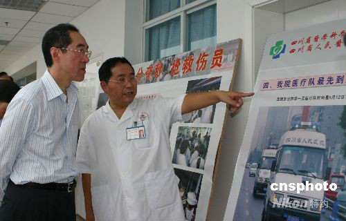 香港政務(wù)司司長(zhǎng)唐英年率領(lǐng)特區(qū)政府代表團(tuán)20余人,來(lái)到成都四川省醫(yī)院慰問(wèn)地震中受傷的民眾。圖為唐英年觀看圖板了解醫(yī)院救治地震傷員情況。中新社發(fā) 霍潺 攝