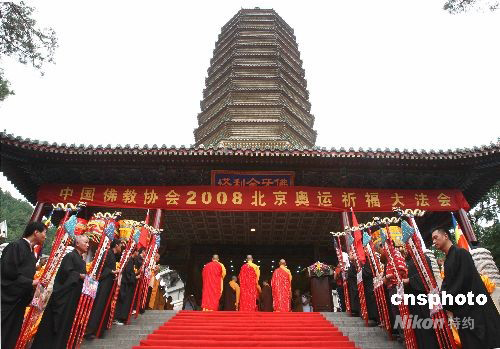 8月1日,中國(guó)佛教協(xié)會(huì)2008北京奧運(yùn)祈福大法會(huì)在北京八大處靈光寺舉行,包括僧人、居士、百姓等近千人參加。中新社發(fā) 張宇 攝