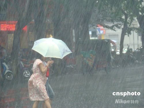 8月6日中午,?谑軣釒эL(fēng)暴“北冕”影響,不時(shí)下起瓢潑大雨。據(jù)海南省氣象臺(tái)預(yù)報(bào),當(dāng)日白天到夜間,海南島除西部外均將有大到暴雨。圖為行人艱難地在雨中行走。中新社發(fā) 付美斌 攝