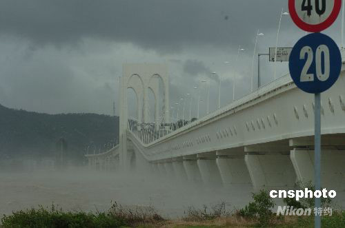 八月六日上午,受熱帶風(fēng)暴“北冕”影響,澳門掛出八號(hào)風(fēng)球,三座連接半島和離島的大橋橋面關(guān)閉,唯圖中西灣大橋的下層通道可供車輛使用。中新社發(fā) 畢永光 攝