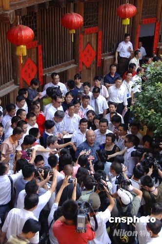 八月十四日下午,中國(guó)國(guó)民黨主席吳伯雄來(lái)到福建永定縣的高北土樓群參觀游覽,眾多記者一路追隨采訪。中新社發(fā) 鄭祚聲 攝
