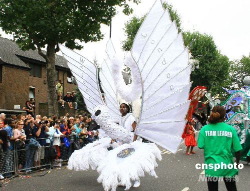 當(dāng)?shù)貢r(shí)間25日,歐洲最大規(guī)模的街頭文化藝術(shù)節(jié)——一年一度的英國(guó)諾丁山狂歡節(jié)在倫敦舉行,今年的主題是“歡迎世界”。圖中白色大鳥的翅膀上寫著“歡迎來(lái)倫敦”。中新社發(fā) 李鵬 攝