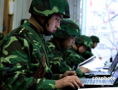 中國人民解放軍“勵兵--2008”演練8月26日拉開帷幕。當(dāng)日上午濟(jì)南軍區(qū)某機(jī)械化步兵旅指揮機(jī)關(guān)向所屬部隊(duì)下達(dá)了進(jìn)入戰(zhàn)備狀態(tài)命令,部隊(duì)迅速進(jìn)入戰(zhàn)位嚴(yán)整以待,戰(zhàn)備狀態(tài)將隨時升級。中新社發(fā) 宋吉河 攝