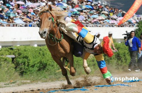 9月1日,2008中國(guó)拉薩雪頓節(jié)馬術(shù)表演和賽牦牛在拉薩賽馬場(chǎng)舉行。馬術(shù)表演和賽牦牛是藏民族傳統(tǒng)體育競(jìng)技比賽,當(dāng)日來(lái)自拉薩市縣區(qū)的幾支隊(duì)伍進(jìn)行了精彩的騎馬射擊、馬術(shù)表演、拾哈達(dá)及賽牦牛活動(dòng),吸引了成千上萬(wàn)的游客和市民前來(lái)觀看。中新社發(fā) 周波 攝