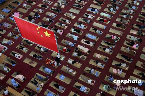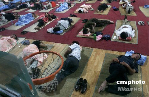 2008年9月3日,華中師范大學(xué)在開學(xué)首日為新生家長們提供免費(fèi)住宿。許多學(xué)生家長暫住在校方免費(fèi)提供的室內(nèi)大地鋪上。中新社發(fā) 攝記 攝