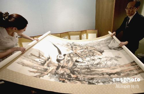 香港蘇富比2008秋季中國書畫拍賣會將于十月六日在香港會展中心舉行,其中吳冠中、張大千作品成為焦點。圖為九月九日舉行的傳媒預展會上介紹張大千一百一十歲誕辰紀念專輯之作,于一九五九年的《老樹騰猿》。中新社發(fā) 張勤 攝