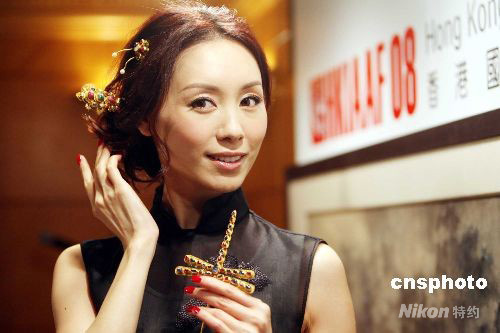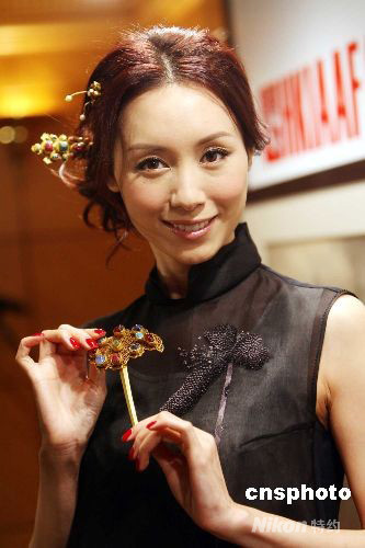 九月十日,香港藝人郭可盈展示明代黃金發(fā)飾。當日,香港國際藝展公司向傳媒預展一批將在十月四日在“2008香港國際古玩及藝術品博覽會”上拍賣的珍品。中新社發(fā) 洪少葵 攝