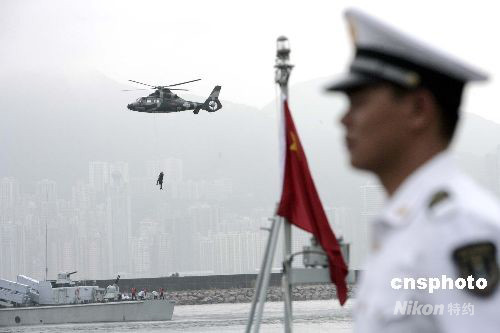 圖為駐港部隊槍械團體操表演。中新社發(fā) 張勤 攝